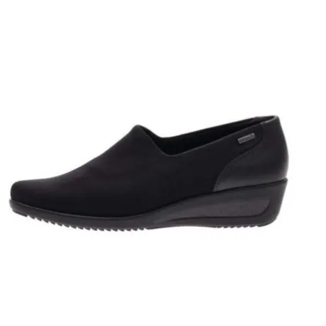 With these slippers from ara, women are always comfortable and fashionable. The comfortable Highsoft function, an interplay of soft upper material and a sole with a special foam insert, adapts perfectly and gives the shoe its shapely design. At the same time, it offers pleasant support and flexibility thanks to the gentle absorption of the arch of the foot. In order to meet the needs of strong feet, the generous shoe width provides enough space and thus prevents pressure points from developing. Another advantage is the practical removable footbed, which can be easily cleaned if necessary or exchanged for your own insoles. The waterproof and breathable Gore-Tex membrane creates an all-round pleasant foot climate thanks to its extremely fine-pored structure – no matter what the weather. The 3 cm high wedge heel conjures up wonderfully staged legs. The look can be wonderfully rounded off with matching accessories, such as sunglasses. A meeting with friends or a trip with the family? No problem! The black loafer from ara is a real stroke of luck in terms of comfort and design.