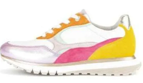 This Gabor trainer offers a wide and comfortable fit, thanks to its COMFORT wide range and OPTIFIT reversible insole. The sneaker features a material mix of leather and Foulard/Velour, with an offwh/gum/sole k.Color in a multicolour design.