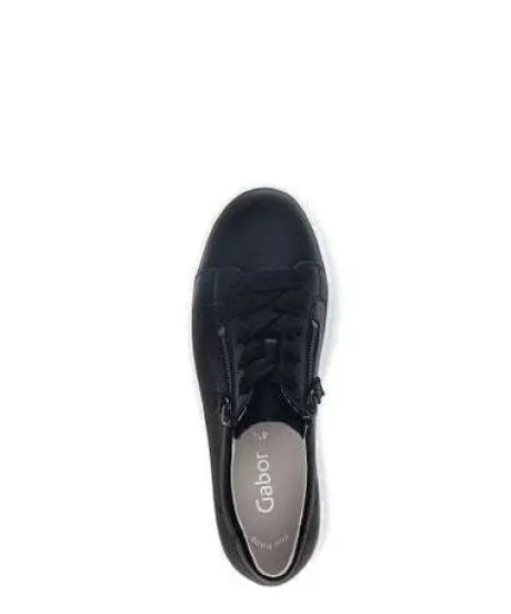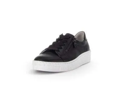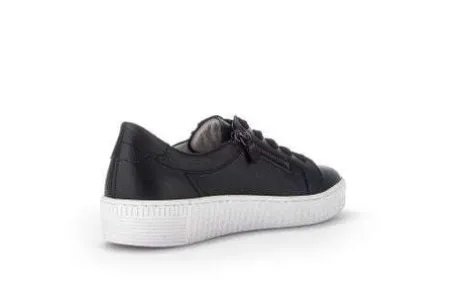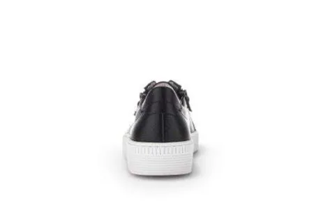 The Gabor 5333427- Trainer features a sleek, black, plain leather upper material with the BEST FITTING attribute and a convenient side zip for easy wear.