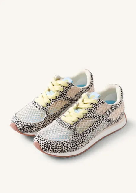 Sneakers with mesh overlays, faux fur with a dalmatian print, and coloured accents. They feature a padded insole. Possible variations in the leather or finish between shoes reflect the authenticity of the artisanal process and the use of natural leathers. Leather and breathable polyester upper. Breathable polyester lining and insole. TPR sole.