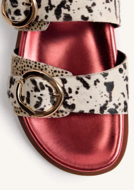 Leather sandals with an animal print and buckles. They feature a bio-textured sole lined with metallic leather, ergonomically designed to distribute weight evenly. Leather upper, lining, and insole. Lightweight EVA sole.