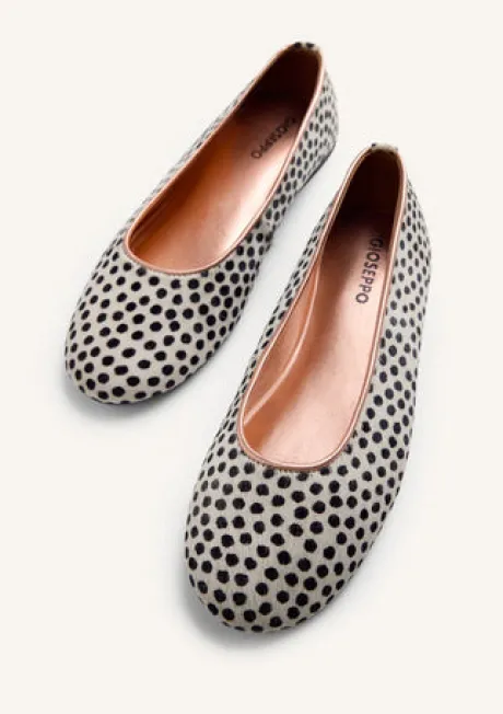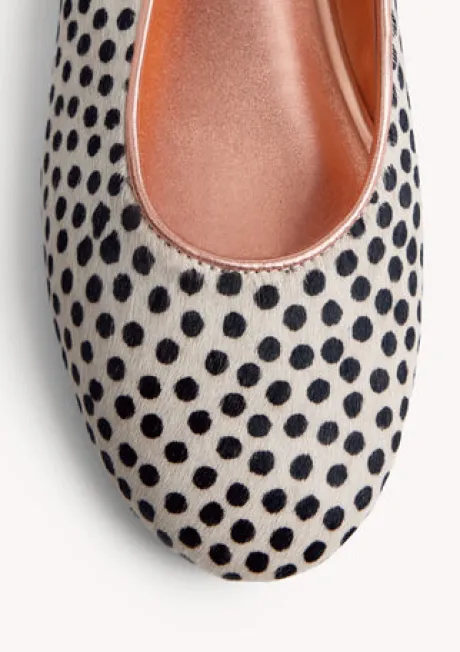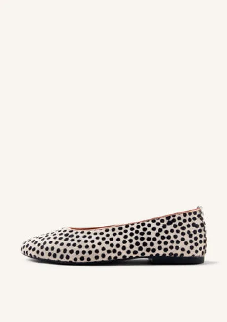 Leather ballet flats with a Dalmatian print. Metallic interior. Round toe. Cushioned insole. This model stands out for its flexibility and lightness, as it eliminates heel counters and toe stops. Leather upper, lining, and insole. Flexible rubber sole.