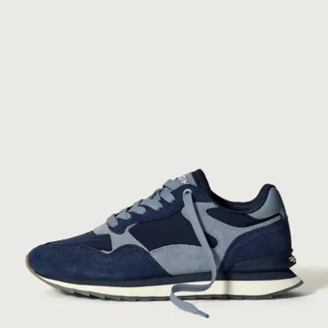 Retro-style sneakers combining different materials and colors. Embroidered logo detail on the back. Closure with laces.