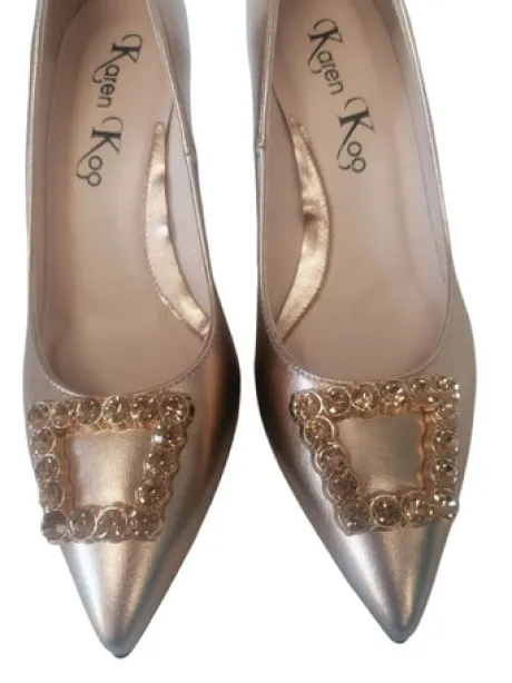 Indulge in opulent luxury with the Karen Koo Court Shoe – 8276COP, crafted from shimmering metallic leather in a stunning bronze gold hue. Adorned with a dazzling yellow gold broach, this elegant shoe is a true masterpiece.