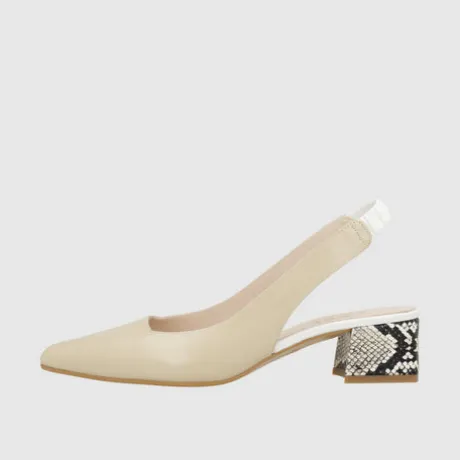 Elegant design combined with a snake print heel. Made with a 5 cm block heel. Elastic Back strap . Pointed toe. Leather-lined interior. Includes new gel insole for extra comfort with every step. Made in Spain.