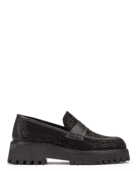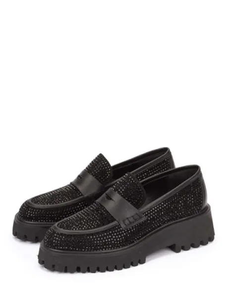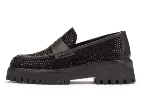 The Pedro Miralles 28088 Loafer features elegant black rhinestones, making it a versatile wardrobe staple that can be worn day or night. The platform sole provides exceptional comfort for long-term wear.
