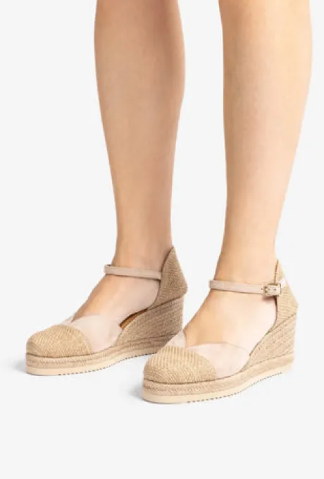 Round toe espadrille made in suede. Recycled Ecolino fabric toe, made from 100% recycled plastic bottles. Raffia heel counter and a strap that can be adjusted with the metal buckle. 2cm platform and a 7.5cm wedge covered in jute. Lighter and more flexible EVA sole than ever before thanks to the Unisa Superlight technology.