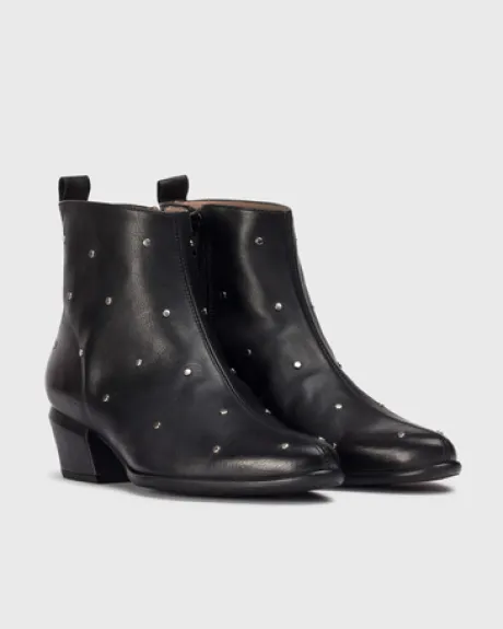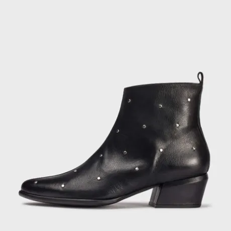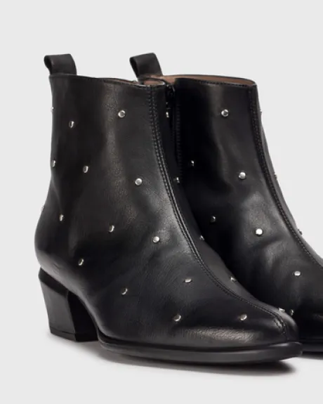 Black leather ankle boots in cowboy style with silver studs. This model has a 4 cm height heel, with a slim toe. With a MemoryGel insole that provides cushioning and adapts to your stride for comfort during use, get yours and walk in style and comfort with every step!