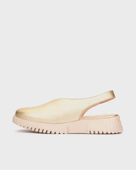 FLEXFLY 11 sling back shoes crafted from metallic gold-finish leather. The clean, wrap-around upper contrasts with the open back, visually lightening the design and adding a touch of freshness, while the back strap ensures a comfortable and stylish fit. The lugged outsole, created with WondersFly™ by XL EXTRALIGHT® technology, guarantees exceptional lightness and extraordinary comfort. The Memory Gel insole molds perfectly to the foot, providing comfort with every step.