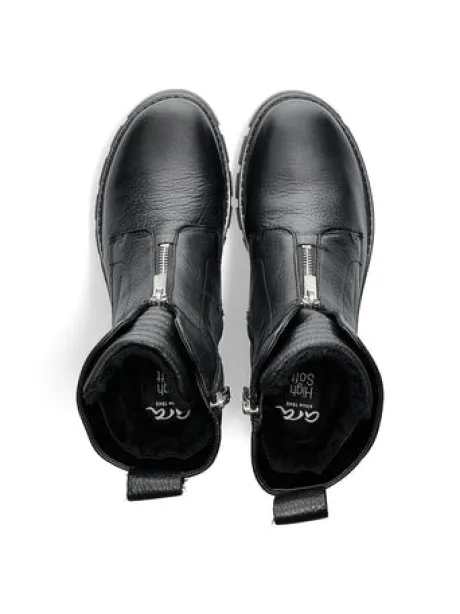 These lined ankle boots from Ara will delight you for many winters. This model features an upper made of high-quality smooth leather and comes in a sophisticated, timeless black. Soft, warm lining has been chosen to keep your feet warm and protect them from the cold. The practical zipper ensures effortless entry and prevents pressure points. Those who rely on orthopedic insoles can easily replace the removable insole. By individually adapting to the foot, the Highsoft function, consisting of a soft upper and a sole with a special foam insert, ensures comfortable support and a feeling of well-being with every step. Thanks to the additional decorative zipper, the robust sole, and the long tongue, this women’s shoe looks particularly versatile and modern