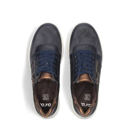 Easy going through the day with this ultra-light and sporty sneaker by ara. The leather upper is silky soft and encloses perfectly the foot. Thanks to the comfortable width, your feet have got enough space. The soft all around padding offers even more comfort. Thanks to the combination of lacing and zip fastener the shoe can easily be put on and taken off and can be perfectly adapted to your needs. On the inside, the shoe is equipped with soft terry cloth which ensures a pleasant foot climate and absorbs moisture. The removable footbed is also covered with terry cloth and therefore dries quickly.