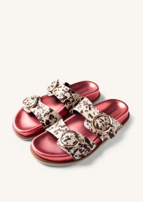 Leather sandals with an animal print and buckles. They feature a bio-textured sole lined with metallic leather, ergonomically designed to distribute weight evenly. Leather upper, lining, and insole. Lightweight EVA sole.