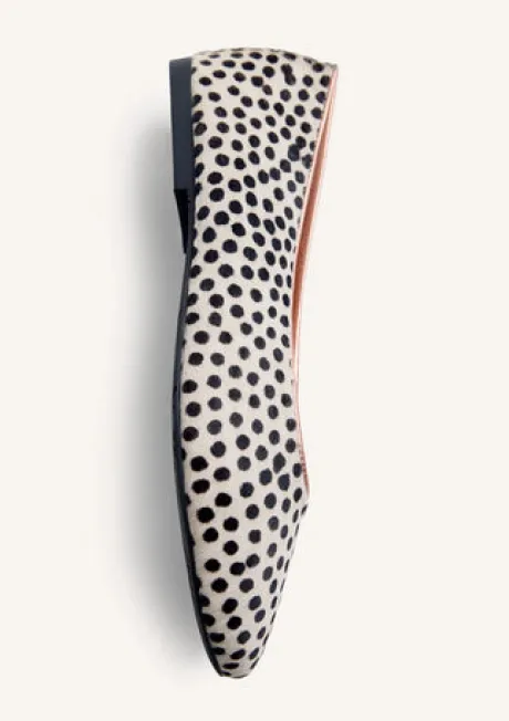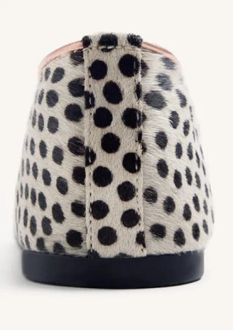 Leather ballet flats with a Dalmatian print. Metallic interior. Round toe. Cushioned insole. This model stands out for its flexibility and lightness, as it eliminates heel counters and toe stops. Leather upper, lining, and insole. Flexible rubber sole.