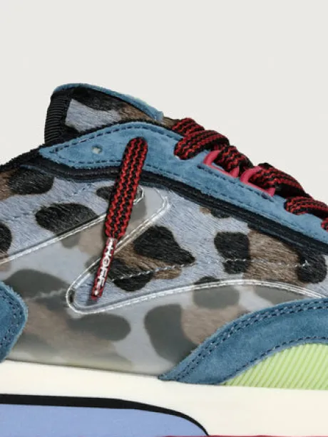 Retro-style sneakers combining different materials and colors. Embroidered logo detail on the back. Closure with laces.