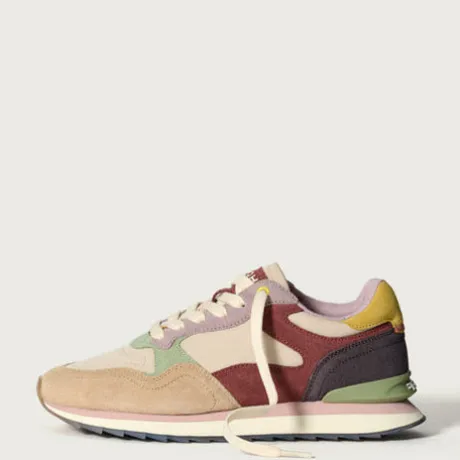 Retro-style sneakers combining different materials and colors. Embroidered logo detail on the back. Closure with laces.