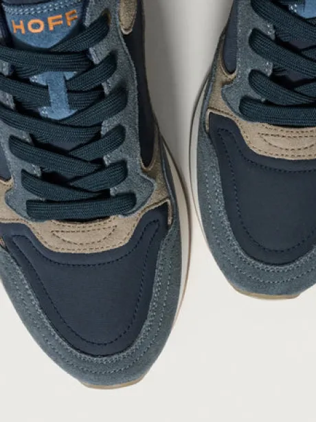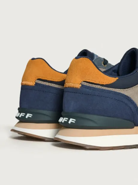 Retro-style sneakers combining different materials and colors. Embroidered logo detail on the back. Closure with laces.