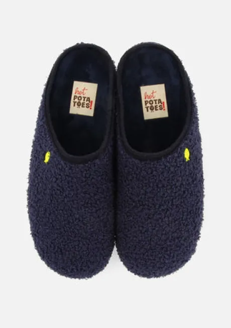 Step into cozy charm with the Hot Potatoe slippers in navy blue! Featuring a soft sheepskin-style design and a breathable lining, your feet stay comfy and fresh. The removable insole, crafted from recycled polyester, lets you customize your fit or swap for easy cleaning. Plus, the natural rubber sole with recycled EVA flakes gives you grip and eco-friendly vibes. Perfect for lounging or quick errands, these slippers bring playful comfort straight to your feet.