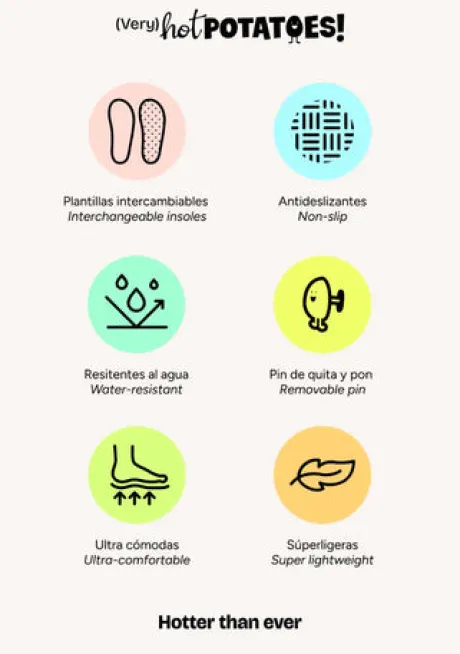 To enjoy the comfort of Hot Potatoes anywhere. Flip-flops with removable pin in the same colour as the insole. Includes 2 removable and interchangeable insoles. Composition: -Fylon upper, a shock-absorbing, water-resistant, non-slip and ultra-light material. -Fylon insole. -Soft towel insole.