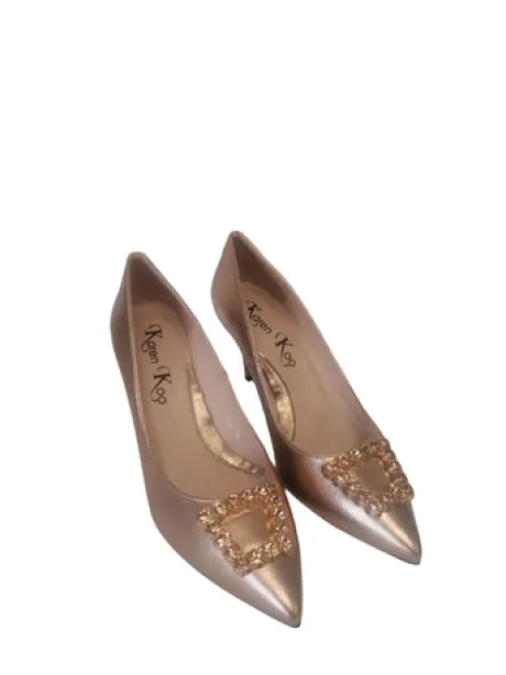 Indulge in opulent luxury with the Karen Koo Court Shoe – 8276COP, crafted from shimmering metallic leather in a stunning bronze gold hue. Adorned with a dazzling yellow gold broach, this elegant shoe is a true masterpiece.