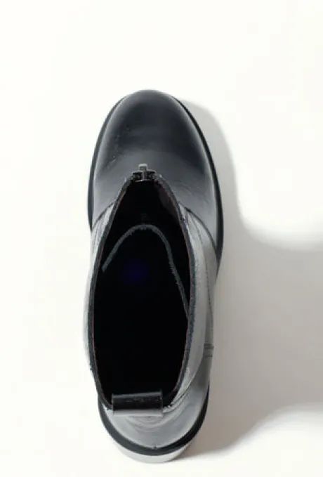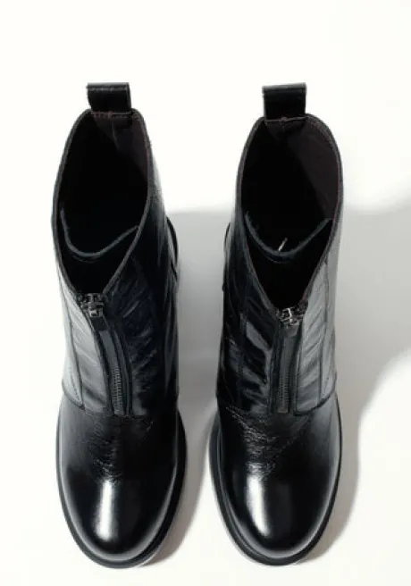 Manufactured and designed in Spain. Crafted from black leather with a subtle cracked, glossy finish, this ankle boot carries a distinct texture that catches the light and adds quiet depth. The sleek almond toe and bold front zip fastening bring a clean, directional feel, while the 5 cm block heel offers everyday wearability. Pair it with a knit midi dress, structured shorts, or wide-leg jeans for a sleek, everyday uniform with a bold finish.
