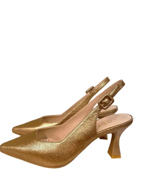JUCO women’s open-toe court shoes by LODI in gold-tone leather. A must-have for adding a chic touch to your look. Crafted with a 7cm geometric heel, the design features a leather-covered buckle on the side. Pointed toe and square neckline. Leather-lined interior. Includes a new gel insole for added comfort. Made in Spain.
