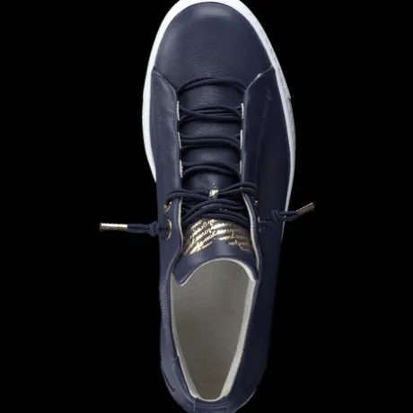 Experience trendy style with the iconic white platform sole of the Paul Green 5017013- Trainer. The navy smooth leather upper is complemented by gold details and a quick lacing system for a sophisticated look. Enjoy unbeatable comfort with the smooth leather lining and soft padded heel cap. Featuring a 15 mm heel height and a special Super Soft design, this trainer also boasts a unique platform sole, entry loop, logo embossing, studded application, and extra light sole.
