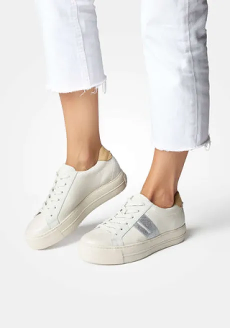 Elevate your style with the newest Paul Green sneaker. Expertly crafted in luxurious white leather with fashionable silver detailing, these casual shoes feature off-white laces and classic Paul Green branding. The supple materials provide excellent comfort for an eye-catching look.