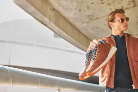 Men’s causal wide fit trainers in tan with navy accents and contrasting white soles.