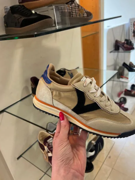 Discover the variety of these sporty sneakers, which are characterized by modern accents and casual chic. Sneakers for women made of nylon with a metallic finish combined with overlapping metallic and synthetic panels. Side V in black suede and heel piece with the brand logo in contrasting leather-effect colors. Closure with two-tone laces. Two-tone sole and black serrated tread that provides better grip.